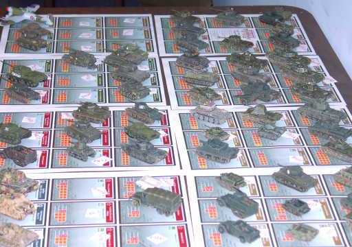 The vehicle models are arranged on the prototype cards. We want to thank all of you who helped us prepare for this supplement, especially our compatriots in England, R. Mark Davies and Ken Natt. When the game came out last year, they wrote to us with some extremely knowledgable questions and criticisms and our response was "Want to Join the Team?" Fortunately they said Yes. Most of our models come from Battlefront, Old Glory (Command Decision), Quality Castings, and Peter Pig. We also found some unusual models from QRF (Quick Reaction Force), and I may have missed some manufacturers. |