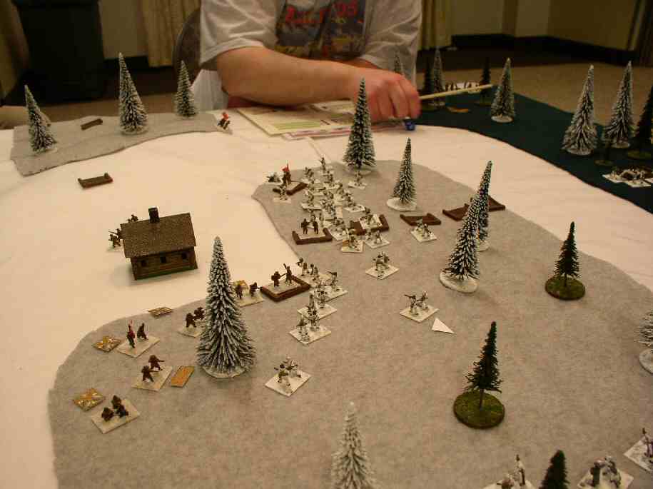 The Russian main line held off the first assault, but the Finns come back. Unlike previous games, this fighting is occurring within the woods, where the cover of the woods and Finn winter camouflage give them an advantage. The Russians put a couple of units in a blocking position on their left flank, but these were quickly overwhelmed. |
